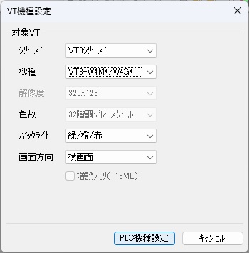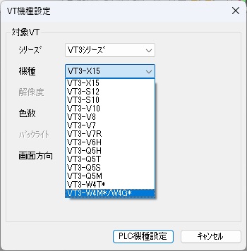 「機種」を「VT3-W4M*/W4G*」に設定する。