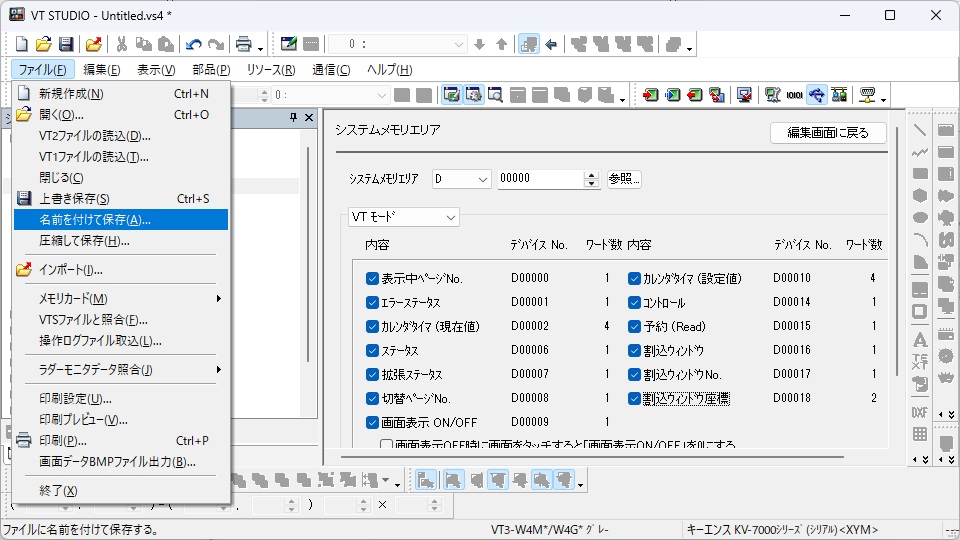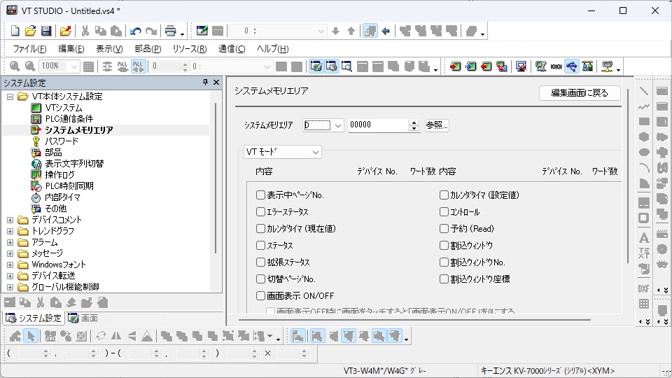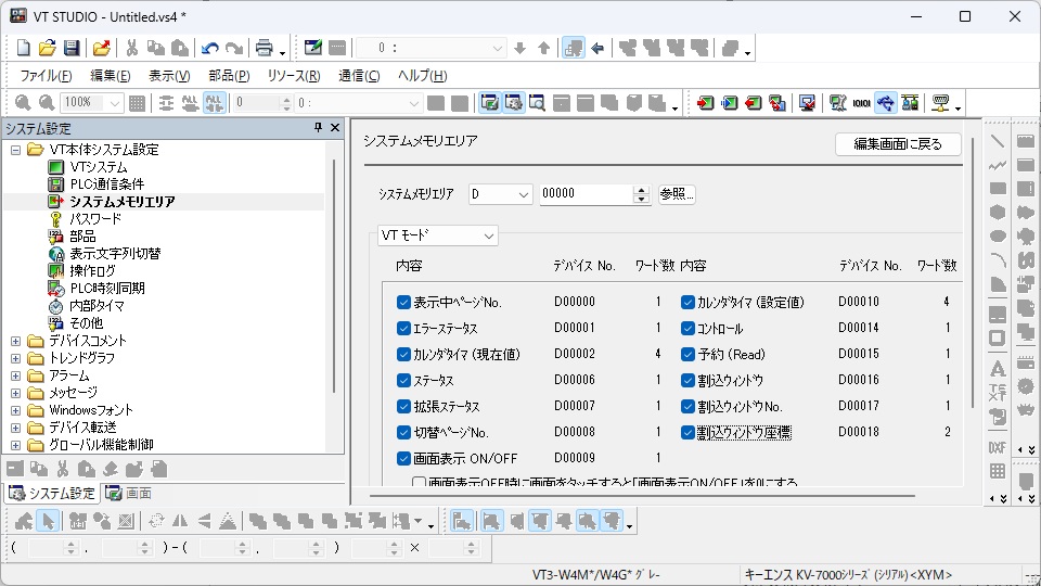 「VT本体システム設定」「システムメモリエリア」とクリックしシステムメモリエリア設定画面を開く。